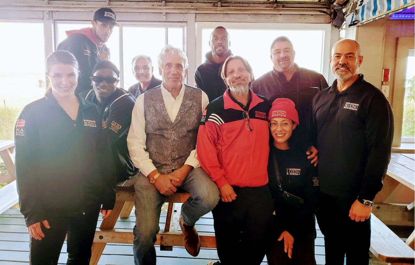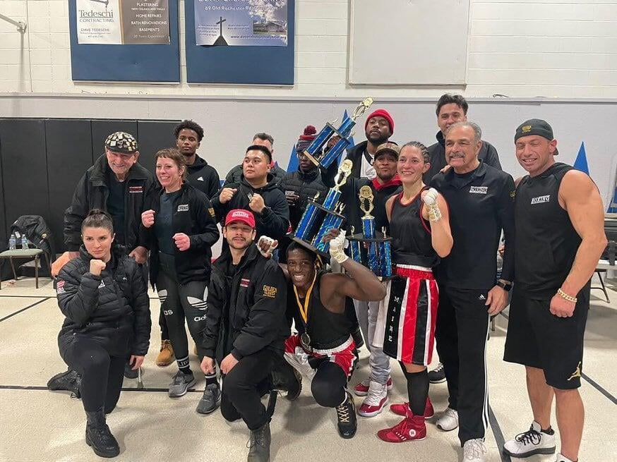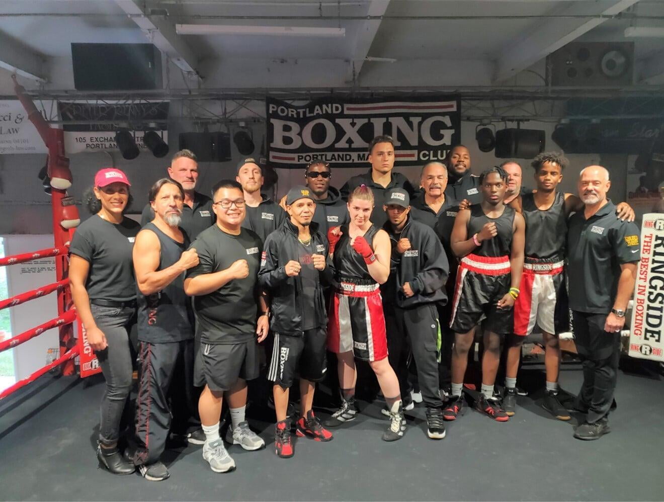 (Far left) Northern New England Golden Gloves Director Joe Siudut with Portland Boxing Club team members (left to right) Assistant Coach Skip Neales, Zordan Holman, President and Head Coach Bob Russo, Jorge Abiague (front), Wade Faria, Lindsay Kyajohnian Francois, Assistant Coach Allen Bunmy (front), Ilyas Bashir (rear), Kate Zehr and Assistant Coach Don Drake. Photo courtesy Steve Shea Photography.